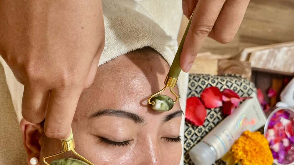 The goal of this facial is to remove damage cells on the skin’s surface with different techniques, such as deep cleansing, exfoliating, massage , with. Jade roller is to help keep skin looking fresh an stay cool.